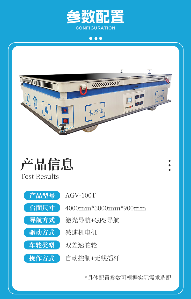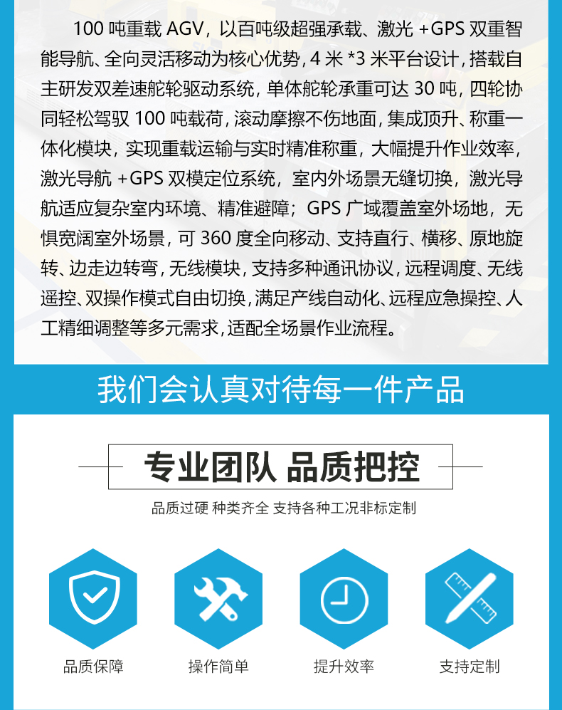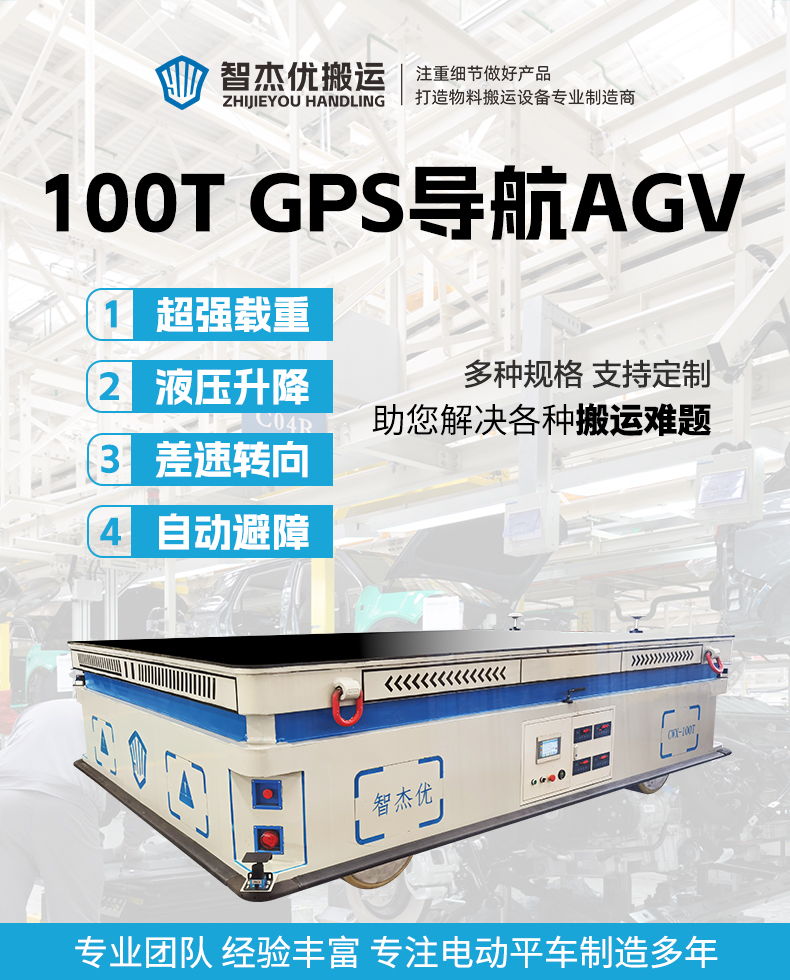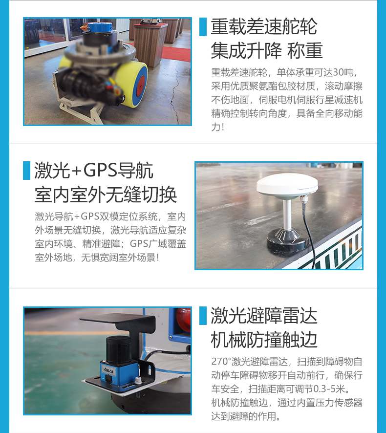 描   述: 100噸重載AGV,百噸級***承載、激光+GPS雙重智能導航、全向靈活移動,為工業(yè)重型物料轉(zhuǎn)運提供新的解決方案。4米*3米平臺設(shè)計,搭載自主研發(fā)雙差速舵輪驅(qū)動系統(tǒng),四輪協(xié)同輕松駕馭100噸載荷,滾動摩擦不傷地面,集成頂升、稱重一體化模塊,實現(xiàn)重載運輸與實時***稱重,激光導航+GPS雙模定位系統(tǒng),室內(nèi)外場景無縫切換,無線模塊支持多種通訊協(xié)議,遠程調(diào)度、無線遙控、線控手柄三種操作模式自由切換,適配全場