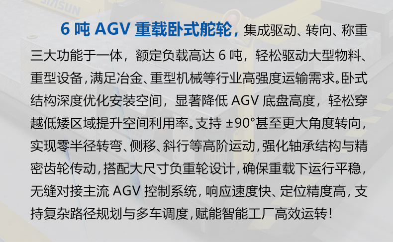 描   述: 6噸級(jí)重載臥式舵輪,集成驅(qū)動(dòng)、轉(zhuǎn)向、稱重三大功能于一體,額定負(fù)載高達(dá)6噸,輕松驅(qū)動(dòng)大型物料、重型設(shè)備,滿足冶金、重型機(jī)械等行業(yè)高強(qiáng)度運(yùn)輸需求。臥式結(jié)構(gòu)深度優(yōu)化安裝空間,顯著降低AGV底盤高度,輕松穿越低矮區(qū)域提升空間利用率。支持±90°甚至更大角度轉(zhuǎn)向,實(shí)現(xiàn)零半徑轉(zhuǎn)彎、側(cè)移、斜行等高階運(yùn)動(dòng)。