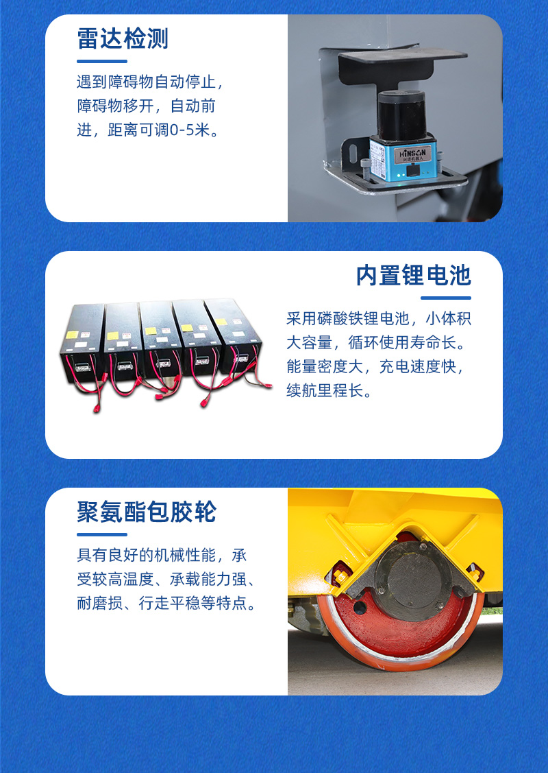 描   述: AGV搬運車指的是無軌車自動行駛的搬運車型,是一種電磁或光學(xué)自動引導(dǎo)運輸車。本臺AGV搬運車載重10噸,臺面長3米、寬2米、高0.6米,車體上裝有電磁光學(xué)自動引導(dǎo)裝置,能夠在設(shè)定的路線上自動行駛,光電感應(yīng)自動避開障礙物,鋰電池供電,壽命長,充電快、續(xù)航里程長;采用聚氨酯包膠輪,耐磨損、行走平穩(wěn)。在工業(yè)應(yīng)用中不需要人員駕駛,實現(xiàn)全自動化。在制造、制藥,物流以及各大重工業(yè)等行業(yè)中大顯身手!