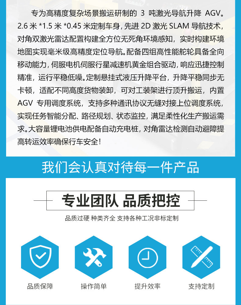 描   述: 3噸激光導(dǎo)航升降A(chǔ)GV,2.6米*1.5米*0.45米定制車身,***2D激光SLAM導(dǎo)航技術(shù),對角雙激光雷達(dá)配置構(gòu)建全方位無死角環(huán)境感知,實時構(gòu)建環(huán)境地圖實現(xiàn)毫米級高精度定位導(dǎo)航。