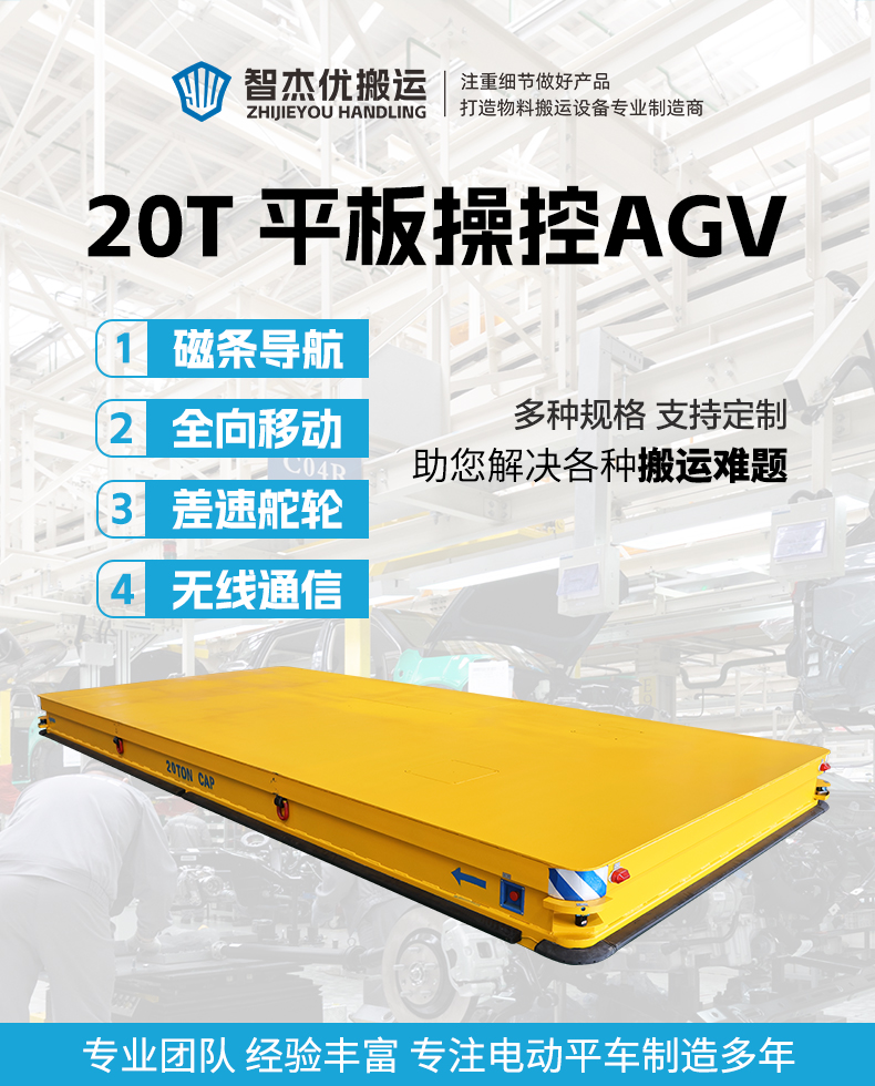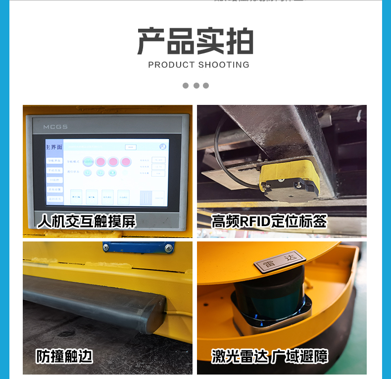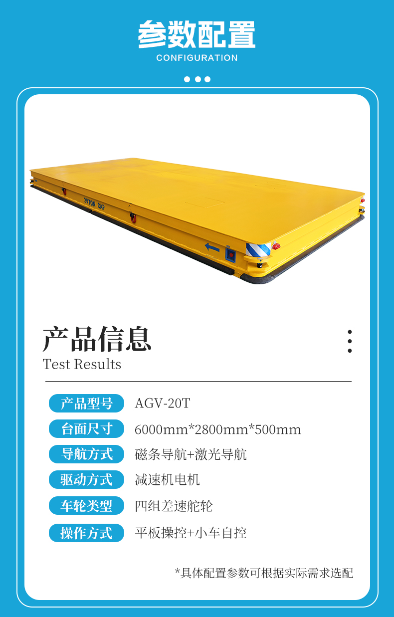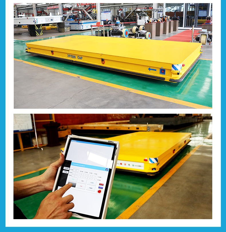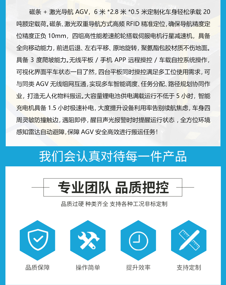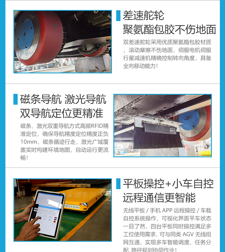 描   述: 磁條+激光導(dǎo)航AGV,6米*2.8米*0.5米定制化車身輕松承載20噸額定載荷。磁條、激光雙重導(dǎo)航方式高頻RFID***定位,確保導(dǎo)航精度定位精度正負10mm,四組高性能差速舵輪搭載伺服電機行星減速機,具備全向移動能力,前進后退、左右平移、原地旋轉(zhuǎn),聚氨酯包膠材質(zhì)不傷地面。具備3度爬坡能力。無線平板/手機APP遠程操控/車載自控系統(tǒng)操作,可視化界面平車狀態(tài)一目了然,四臺平板同時操控滿足多工位使用需求