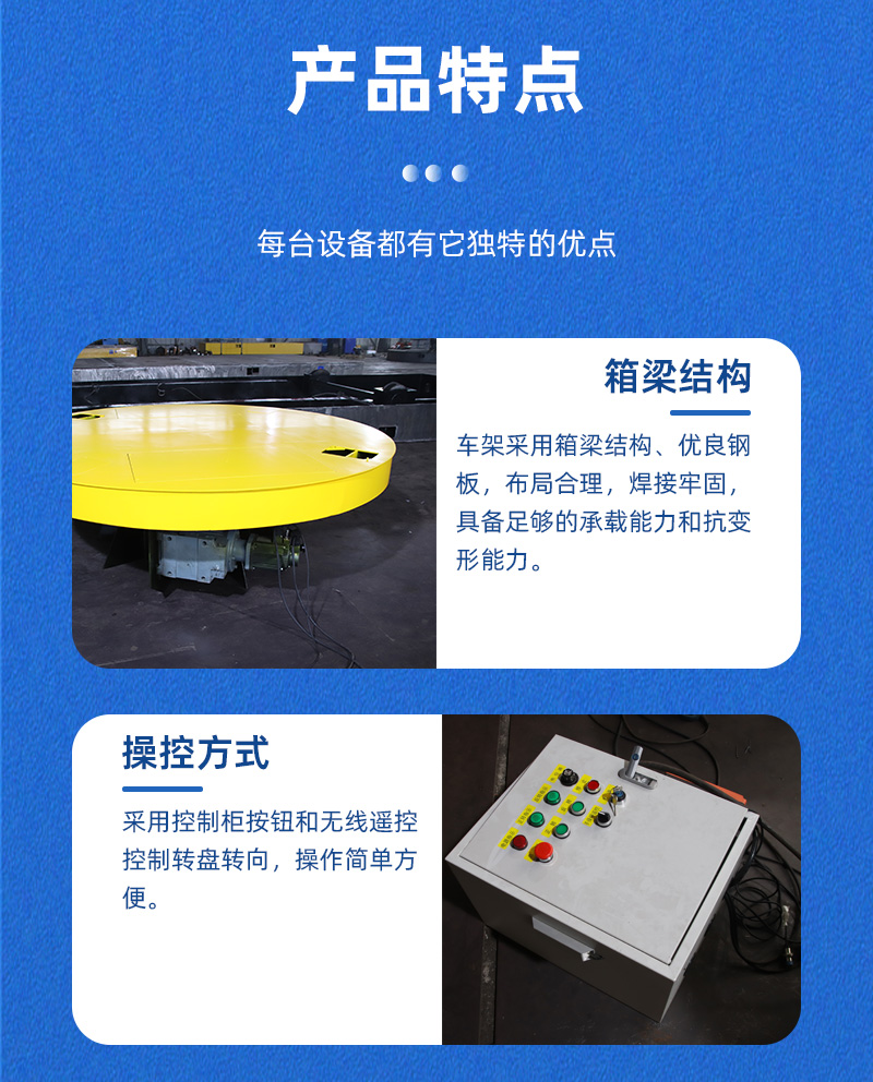 描   述: 工業(yè)重載電動(dòng)轉(zhuǎn)盤(pán)平車(chē)換向旋轉(zhuǎn)臺(tái),轉(zhuǎn)盤(pán)直徑2米高1.3米額定載重5噸,主要用于工業(yè)生產(chǎn)車(chē)間道岔口地軌車(chē)的90°換向,采用控制柜按鈕操作,簡(jiǎn)單方便。