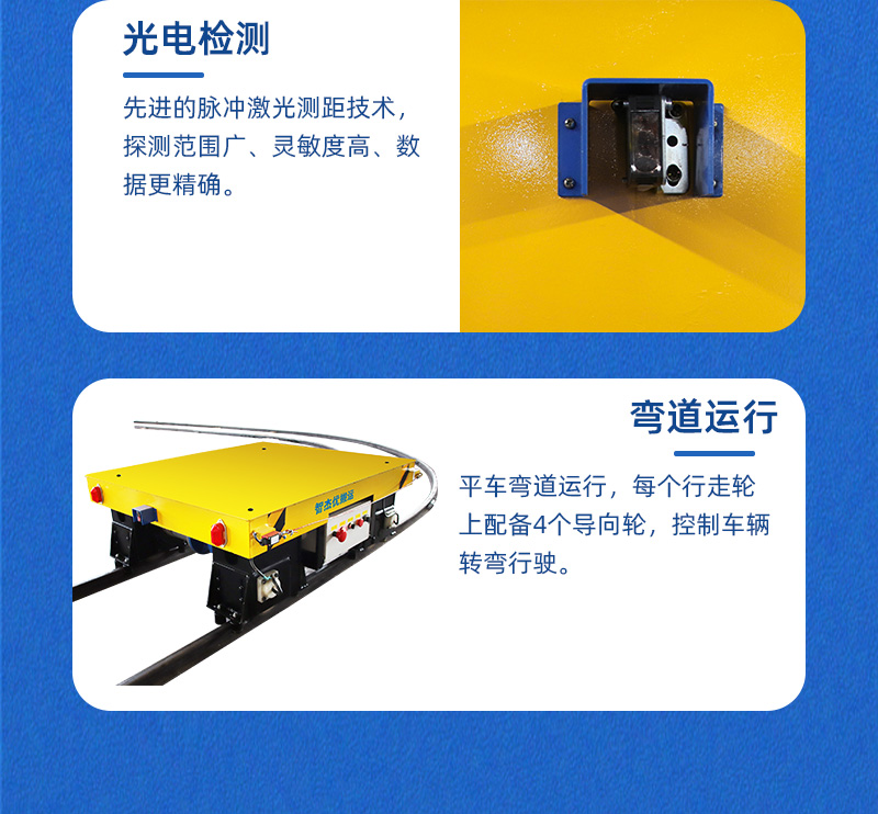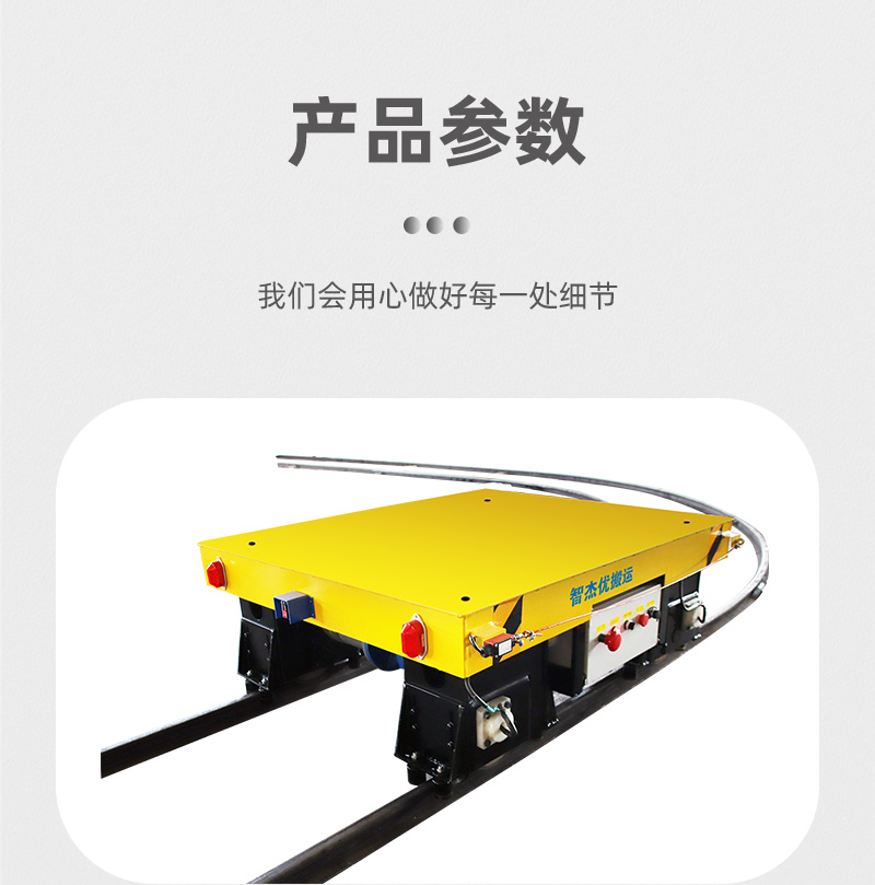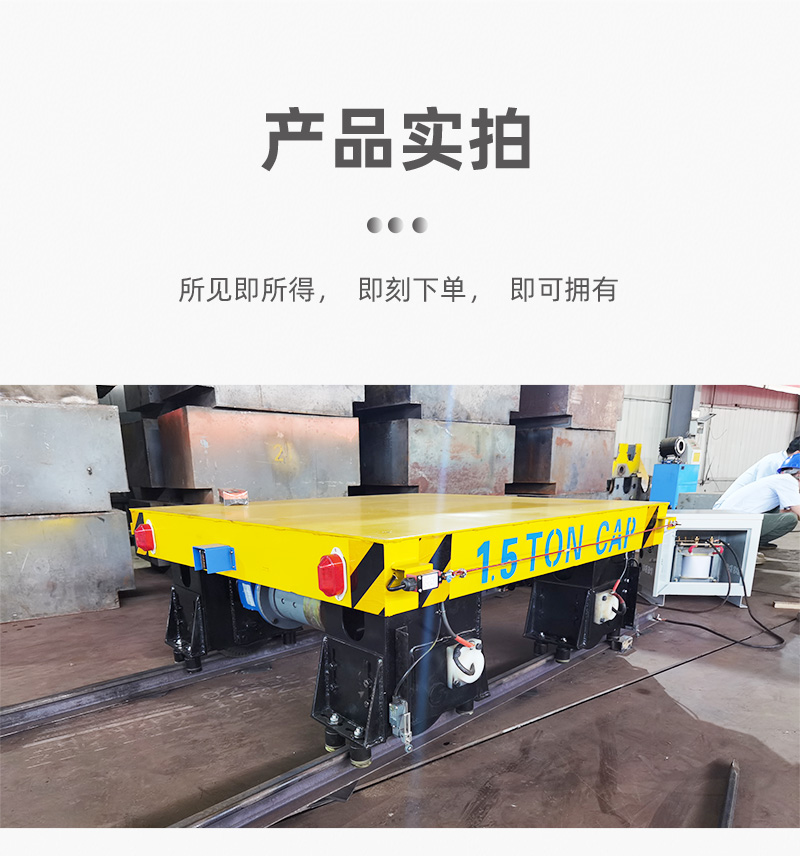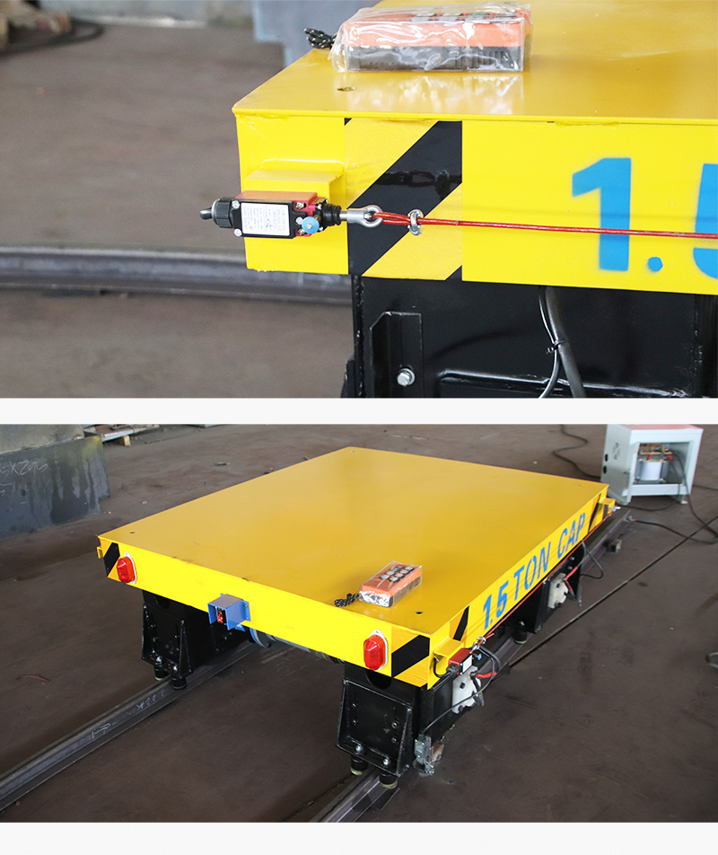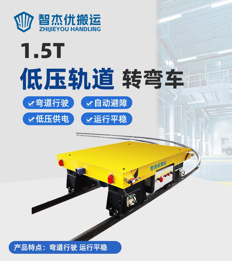 熱線:15517329551 轉(zhuǎn)彎軌道電動(dòng)平車,整車長(zhǎng)1.4米寬1.2米高0.5米載重1.5噸,采用低壓軌道供電方式為平車提供電力,通過地面控制柜將電纜線連接軌道,再經(jīng)平車升壓整流系統(tǒng)輸送給牽引電機(jī),驅(qū)動(dòng)平車運(yùn)行,車輪均做絕緣處理確保沒有觸電風(fēng)險(xiǎn),該種供電方式不受續(xù)航能力限制,可根據(jù)需要靈活調(diào)整線路及搬運(yùn)任務(wù),人工無線遙控操作,車體側(cè)邊設(shè)置拉線急停開關(guān),前后配備光電檢測(cè),確保行車安全。