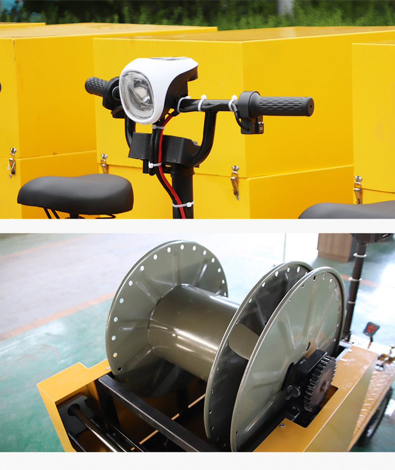 熱線:15517329551 全自動收放線無軌電動平板車,整車長1.5米寬0.6米高1.2米,四輪越野底盤,充氣橡膠輪胎、電動手把操控,蓄電池供電操作簡單運(yùn)行自由速度可控,橡膠輪胎能滿足顛簸路段、沙地等復(fù)雜路段行駛,小車后方裝有自動收放電纜線卷筒,全自動智能收放、自動調(diào)速自動擺線,卷筒速度可與小車行駛速度保持一致。