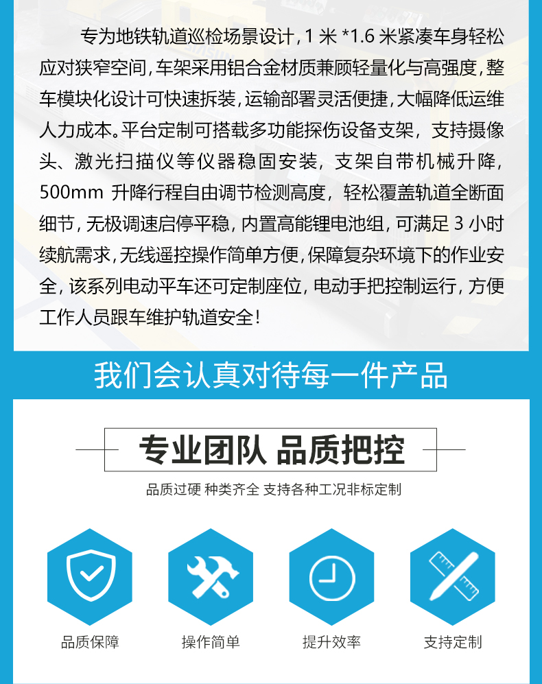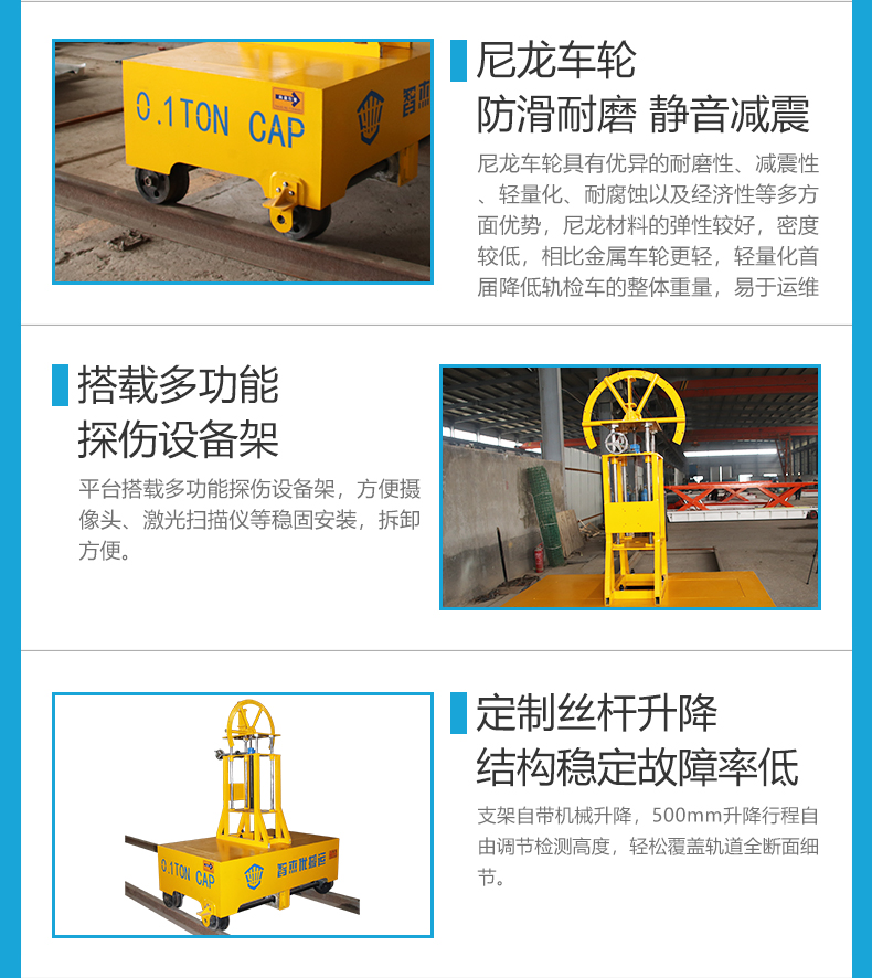 描   述: 專為地鐵軌道巡檢場景設(shè)計,1米*1.6米緊湊車身輕松應對狹窄空間,車架采用鋁合金材質(zhì)兼顧輕量化與高強度,整車模塊化設(shè)計可快速拆裝,運輸部署靈活便捷,大幅降低運維人力成本。平臺定制可搭載多功能探傷設(shè)備支架,支持攝像頭、激光掃描儀等儀器穩(wěn)固安裝,支架自帶機械升降,500mm升降行程自由調(diào)節(jié)檢測高度,輕松覆蓋軌道全斷面細節(jié),無極調(diào)速啟停平穩(wěn),內(nèi)置高能鋰電池組,可滿足3小時續(xù)航需求,無線遙控操作簡單方便,