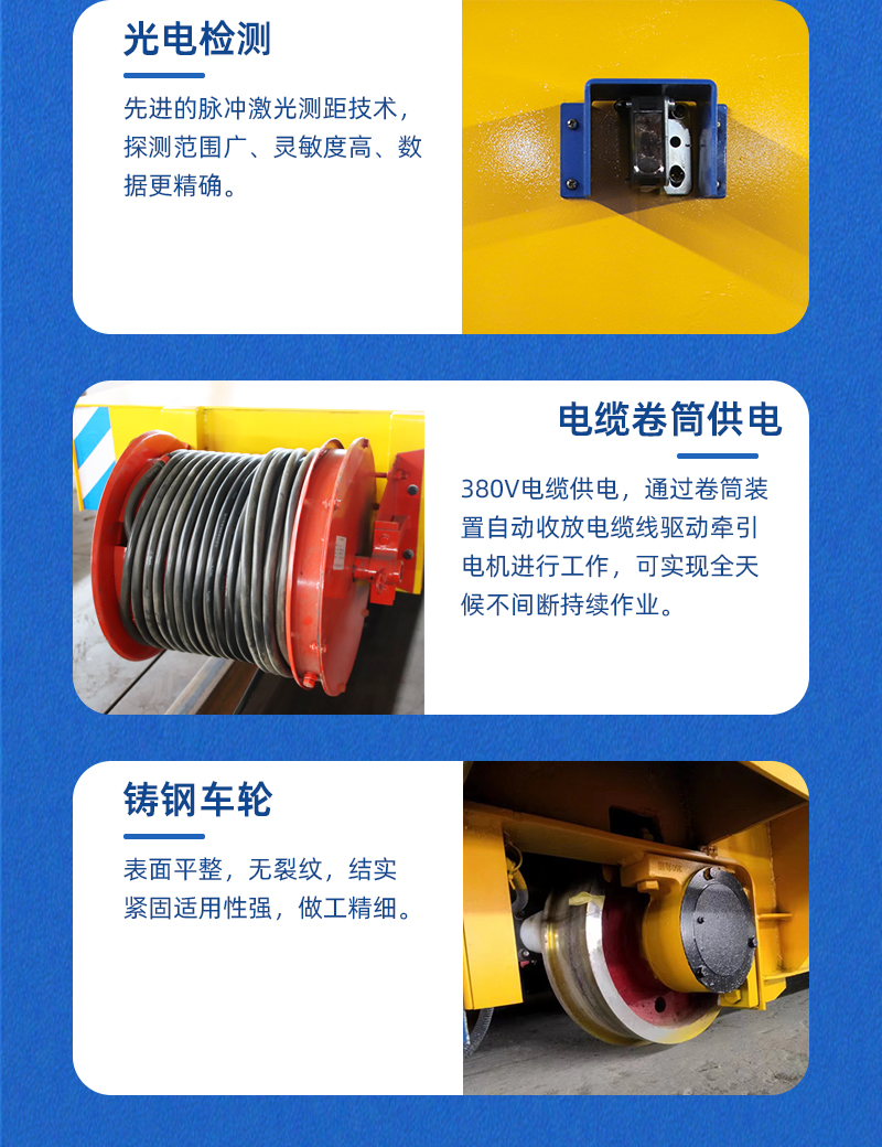 熱線:15517329551 電纜卷筒軌道平車,是將交流380V電纜線依靠平車上卷線裝置的收放電纜實現(xiàn)平車供電,卷線裝置放置在軌道平車的下方,直接將電源通過交流控制系統(tǒng)控制電機的啟動、停止、前進、后退等。定制凹型載物平臺,方便圓形物料轉(zhuǎn)運不易滑落,前后設(shè)有限位開關(guān),可根據(jù)現(xiàn)場設(shè)定地點實現(xiàn)多點位自動??浚擒囬g短距離過跨,重型物料頻繁轉(zhuǎn)運的好幫手!