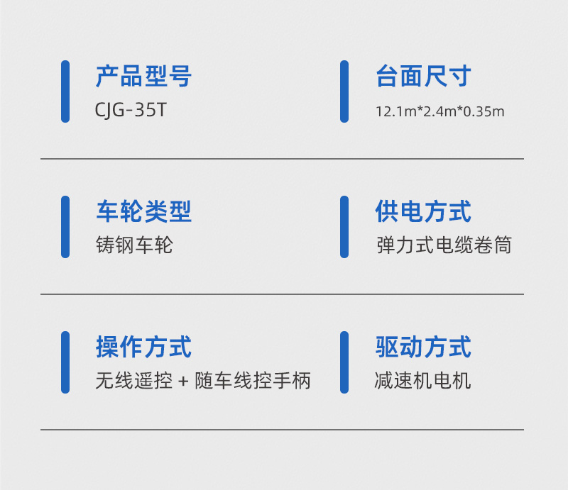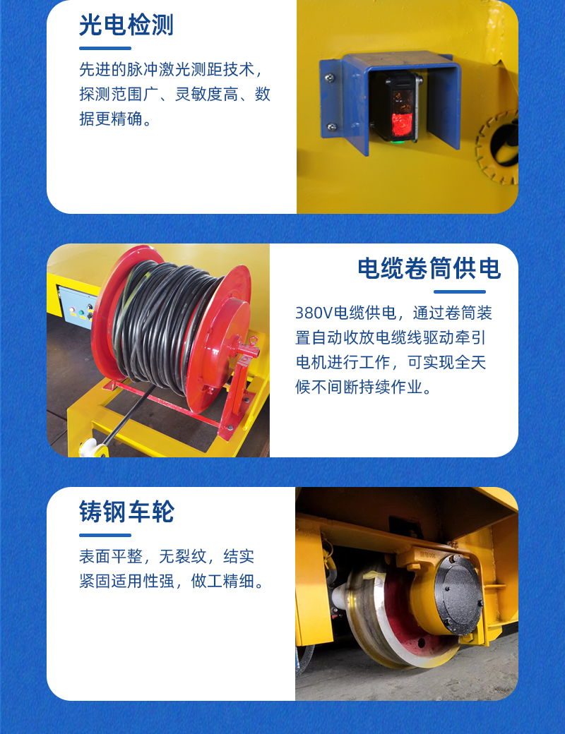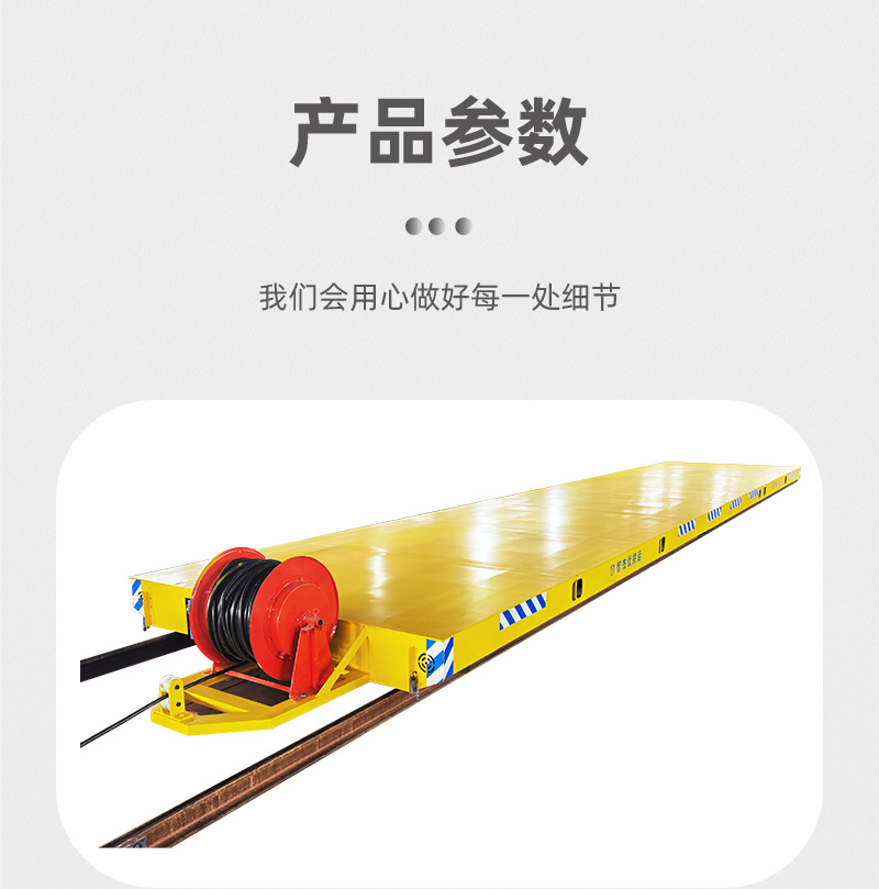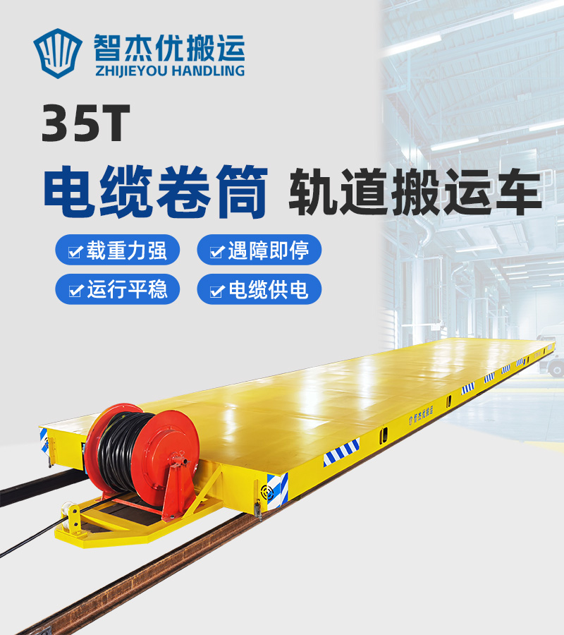 描   述: 重載軌道搬運車,長12米寬2.4米高0.35米額定載重35噸,采用電纜卷筒供電式可遠(yuǎn)距離長時間頻繁運輸,無線遙控操作簡單方便,安全裝置配備齊全,解決企業(yè)重型物料搬運難題!