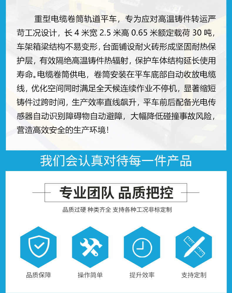 描   述: 重型電纜卷筒軌道平車,專為應(yīng)對(duì)高溫鑄件轉(zhuǎn)運(yùn)嚴(yán)苛工況設(shè)計(jì),長(zhǎng)4米寬2.5米高0.65米額定載荷30噸,車架箱梁結(jié)構(gòu)不易變形,臺(tái)面鋪設(shè)耐火磚形成堅(jiān)固耐熱保護(hù)層,有效隔絕高溫鑄件熱輻射,保護(hù)車體結(jié)構(gòu)延長(zhǎng)使用壽命。電纜卷筒供電,卷筒安裝在平車底部自動(dòng)收放電纜線,優(yōu)化空間同時(shí)滿足全天候連續(xù)作業(yè)不停機(jī),顯著縮短鑄件過(guò)跨時(shí)間,生產(chǎn)效率直線飆升,平車前后配備光電傳感器自動(dòng)識(shí)別障礙物自動(dòng)避障,大幅降低碰撞事故風(fēng)險(xiǎn)!