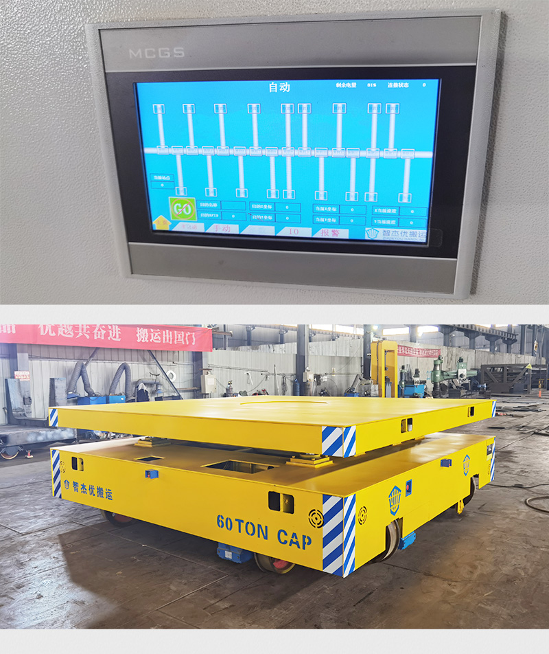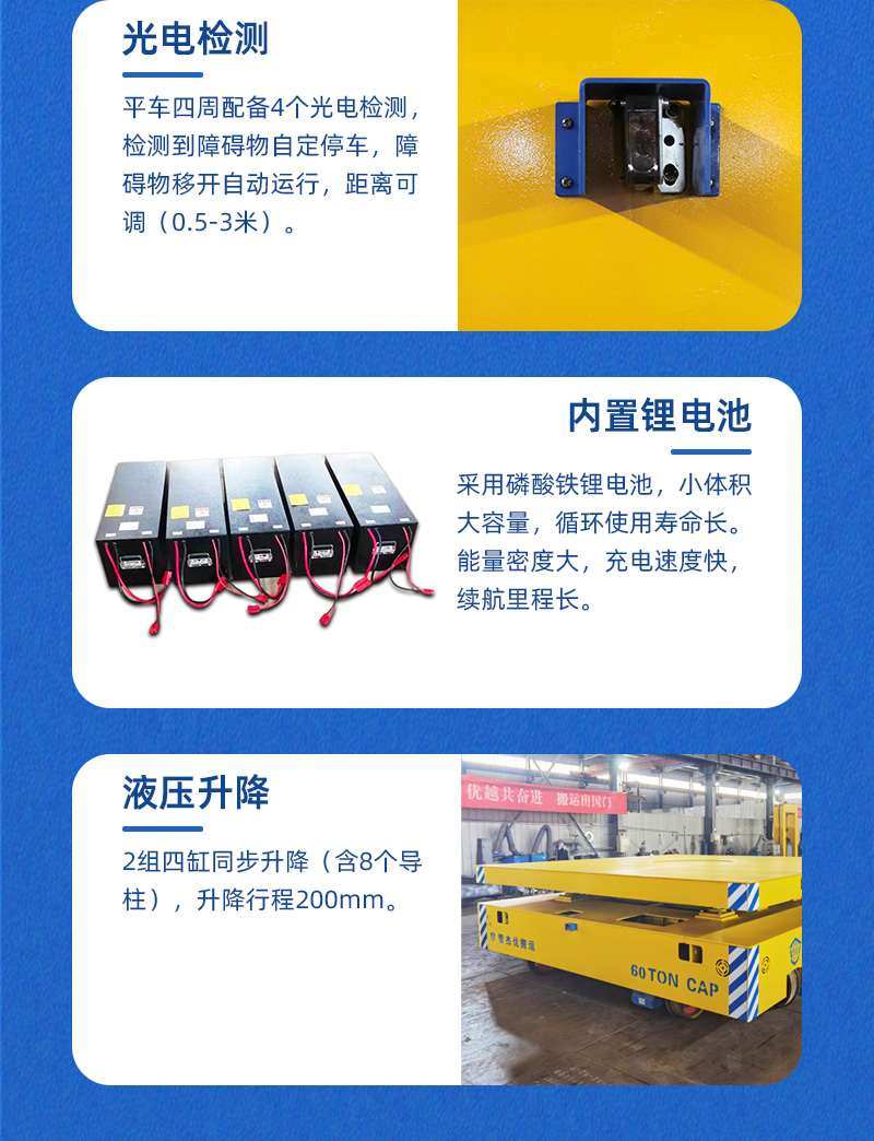 描   述: 縱橫移動rgv軌道車,整車長寬3.5米,高0.9米,可搬運(yùn)60噸的貨物。四缸液壓升降,升降行程200mm,密閉式電氣箱,防水、防潮、防油污、防水霧,鋰電池供電,PLC控制、人機(jī)交互觸摸屏隨時隨地設(shè)定參數(shù),平車設(shè)有18個呼叫工位,16個換軌點(diǎn),通過RFID定位標(biāo)簽、四組接近開關(guān)進(jìn)行位置識別,一鍵到位自動停車,輕松實(shí)現(xiàn)多點(diǎn)位自動停靠換軌,實(shí)現(xiàn)平車縱橫移動!