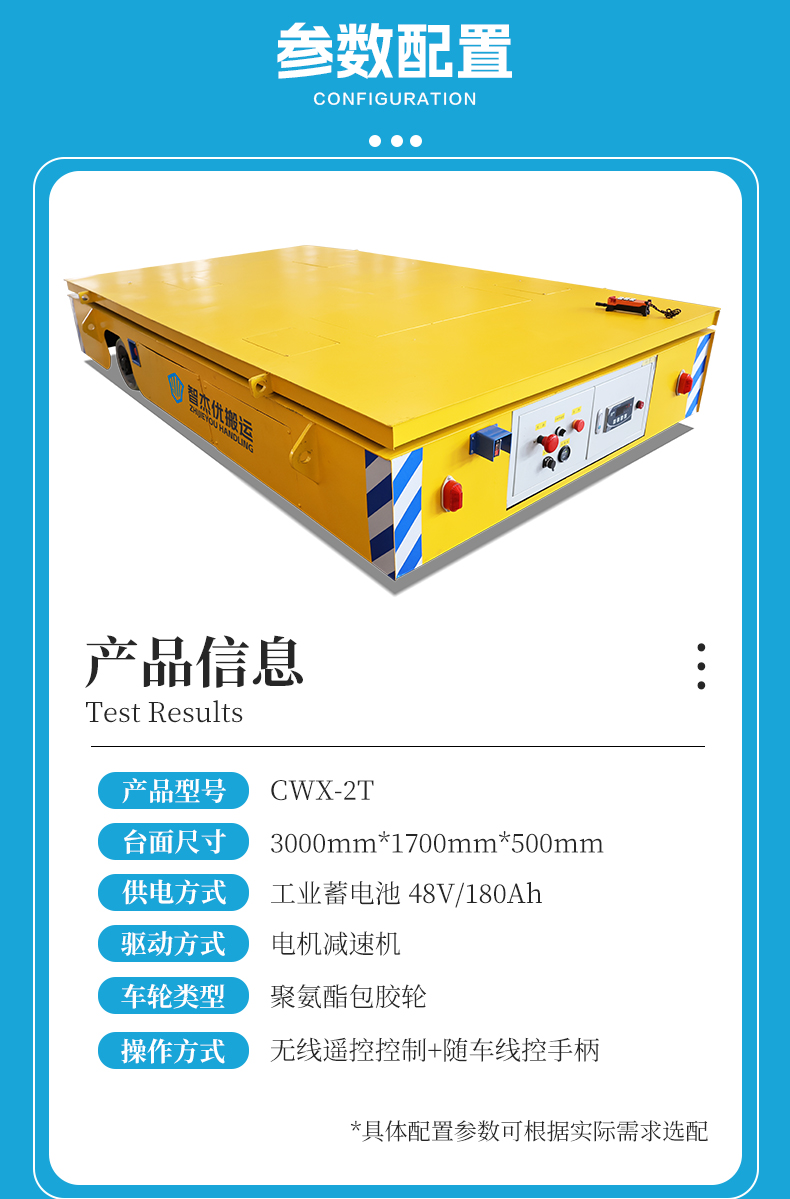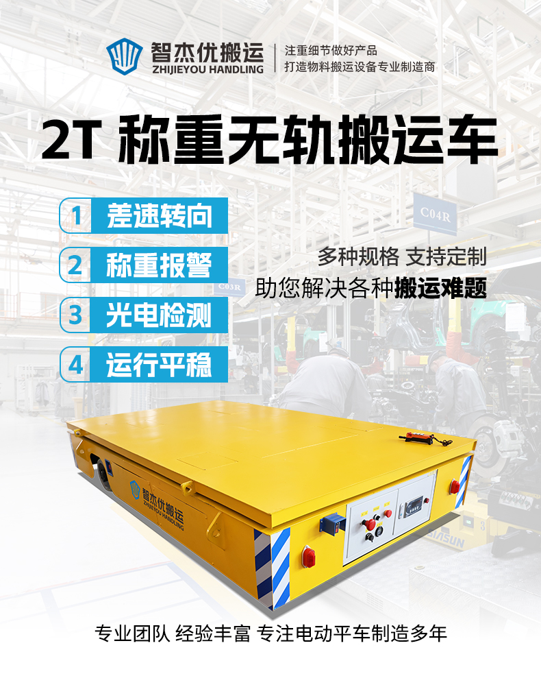 描   述: 智杰優(yōu)搬運研發(fā)生產(chǎn)的稱重?zé)o軌搬運車,整車長3米寬1.7米高0.5米額定載重2噸。主要應(yīng)用于粉末新材料噸包袋的稱重運輸作業(yè)。車體設(shè)有稱重傳感器,具有稱重、超載報警提示功能,超過額定載重報警燈閃爍提示并禁止啟動平車,蓄電池供電,空滿載交替運行不低于4小時,無線遙控控制平車前進后退、左右轉(zhuǎn)彎、加減速,差速轉(zhuǎn)向操控靈活,輪系配備加厚聚氨酯包膠車輪,防滑耐磨壽命長適應(yīng)性強。