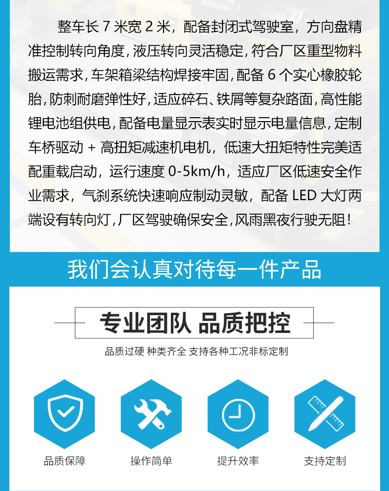 描   述: 電動(dòng)貨運(yùn)平板車,專為重型物料廠內(nèi)運(yùn)輸設(shè)計(jì)的無軌車,5.8米*2米加固平臺(tái)抗壓抗沖擊,前方配置1.2米長(zhǎng)封閉駕駛室,通過方向盤和加速踏板實(shí)現(xiàn)靈活控制,視野開闊操作簡(jiǎn)單舒適性好,搭配6個(gè)實(shí)心橡膠輪胎,確保高承載力和耐磨性,無懼碎石、鐵屑等復(fù)雜路面,免充氣設(shè)計(jì)杜絕爆胎風(fēng)險(xiǎn),電機(jī)減速機(jī)車橋驅(qū)動(dòng),動(dòng)力輸出穩(wěn)定強(qiáng)勁具備移動(dòng)爬坡能力,搭配氣剎制動(dòng),緊急制動(dòng)距離短反應(yīng)迅速!