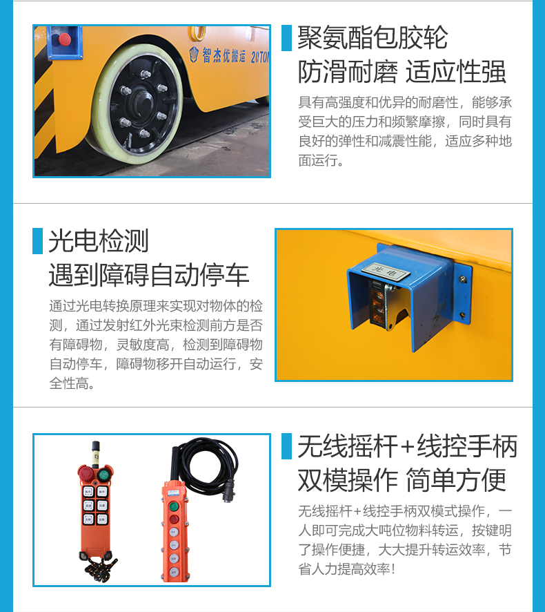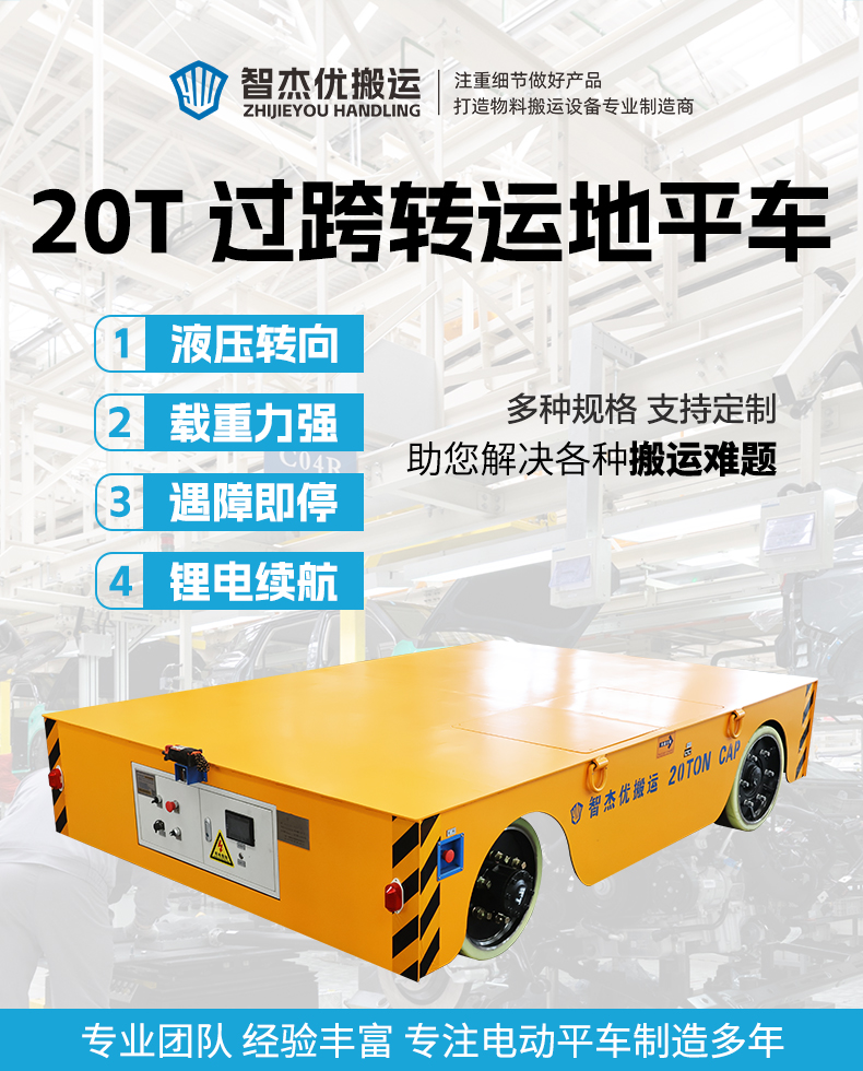 描   述: 您是否還在為跨車間轉(zhuǎn)運物料而發(fā)愁?解決方案來了,智杰優(yōu)搬運研制的液壓轉(zhuǎn)向無軌電動平板車,專為高效、靈活、安全的車間過跨轉(zhuǎn)運而生!