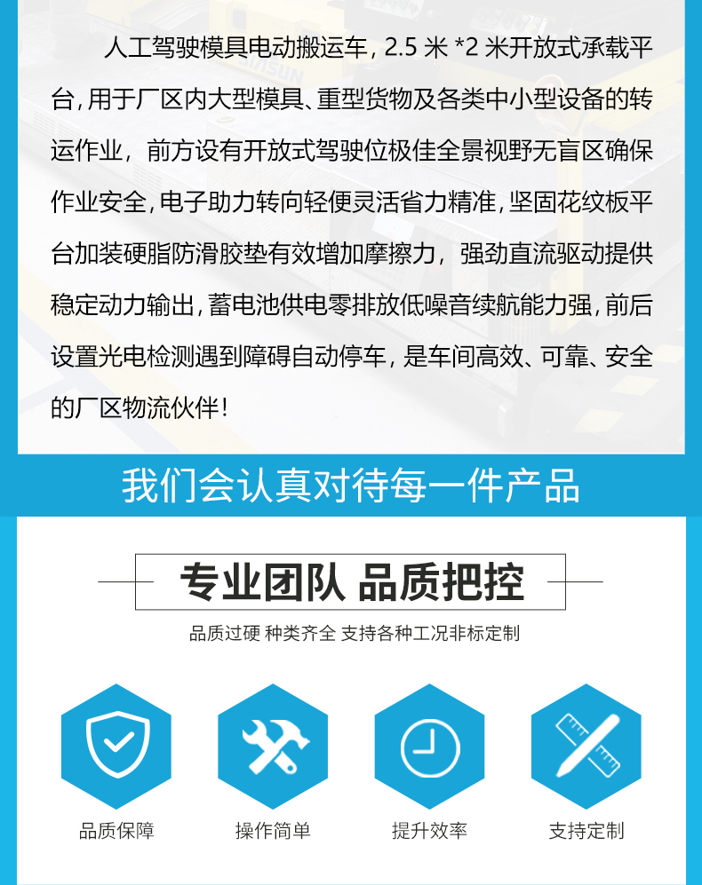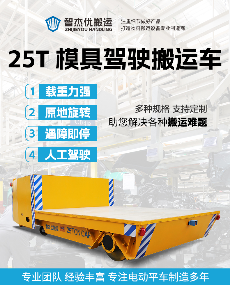 描   述: 人工駕駛模具電動(dòng)搬運(yùn)車,2.5米*2米開放式承載平臺(tái),用于廠區(qū)內(nèi)大型模具、重型貨物及各類中小型設(shè)備的轉(zhuǎn)運(yùn)作業(yè),前方設(shè)有開放式駕駛位***全景視野無盲區(qū)確保作業(yè)安全,電子助力轉(zhuǎn)向輕便靈活省力***!