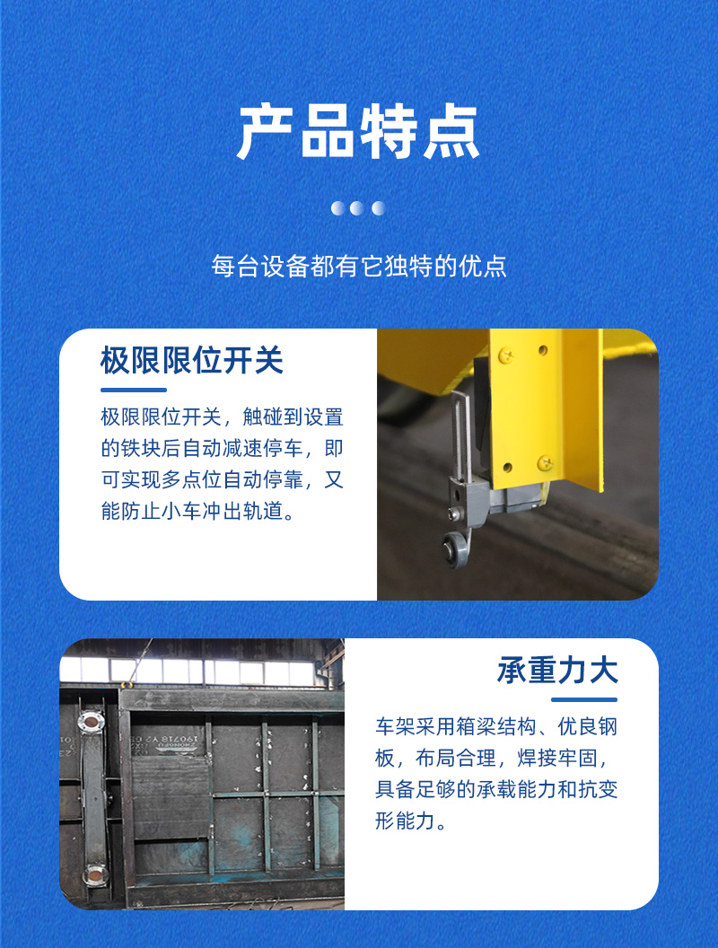 熱線:15517329551 智杰優(yōu)搬運(yùn)為設(shè)備制造業(yè)設(shè)計(jì)生產(chǎn)的蓄電池軌道平板車,長3米寬2.4米高0.45米額定載重20噸,主要用于設(shè)備生產(chǎn)線大型設(shè)備零部件的轉(zhuǎn)運(yùn)作業(yè),蓄電池供電續(xù)航時(shí)間長,采用無線遙控、線控手柄兩種操作方式,平車車架箱梁結(jié)構(gòu)穩(wěn)定載重力強(qiáng),設(shè)有限位開關(guān),可實(shí)現(xiàn)軌道車定點(diǎn)??堪徇\(yùn)作業(yè),同時(shí)極限限位防止小車沖出軌道,平車具有欠壓、過壓、過流、超載、短路、低電量等防護(hù),前后光電檢測自動(dòng)避障,聲光報(bào)警急停開關(guān)確保平車安全平穩(wěn)運(yùn)輸作業(yè)!