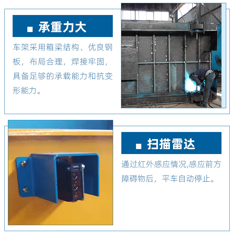 液壓升降無軌電動平車,是一種平面升降機械設(shè)備,產(chǎn)品應(yīng)用廣泛。設(shè)備具有結(jié)構(gòu)穩(wěn)固,故障率低,運行可靠,維護(hù)簡單方便等。剪叉式機械結(jié)構(gòu)和升降方式,使升降平臺有較高的穩(wěn)定性和較高的承載能力。設(shè)備可根據(jù)不同的升降機行程按照要求定制,采用不同的升降方式,有液壓二缸同步升降,剪叉式升降,電動絲桿升降等方式,控制方式由無線遙控控制,PLC自動化控制。隨車線控手柄+工業(yè)無線遙控器可選,電動轉(zhuǎn)向可360度原地旋轉(zhuǎn),聲光一體報警和激光檢測,遇障礙自動停車,充滿自動斷電,聚氨包膠車輪,斷電自動剎車(可調(diào))。移動靈活的車身,方便快捷,自動化現(xiàn)代企業(yè)安全生產(chǎn)的理想設(shè)備。