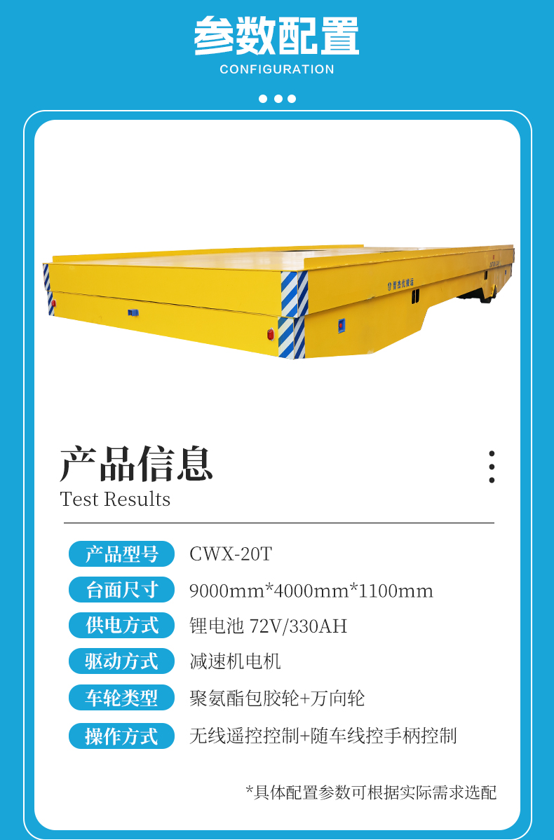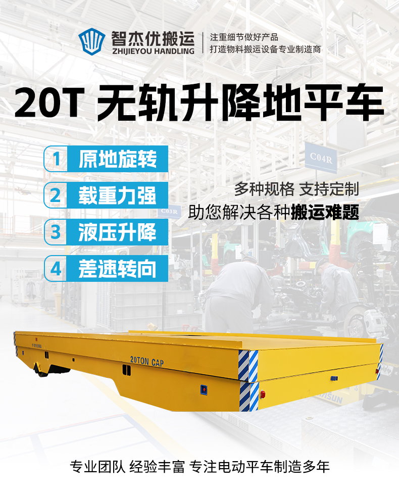 描   述: 20噸升降無軌平板轉(zhuǎn)運(yùn)車,9米超長臺面*4米寬體承載平臺可適配大型設(shè)備及零部件的跨車間轉(zhuǎn)運(yùn),臺面定制整體液壓升降,升降行程300mm整體頂升后車身高度可達(dá)1.4米,輕松應(yīng)對高低落差裝卸場景,輪系配備聚氨酯包膠車輪+萬向輪適應(yīng)多種地面運(yùn)行,差速轉(zhuǎn)向靈活自由,可進(jìn)行原地旋轉(zhuǎn)作業(yè),車間、倉庫、港口全域暢行!