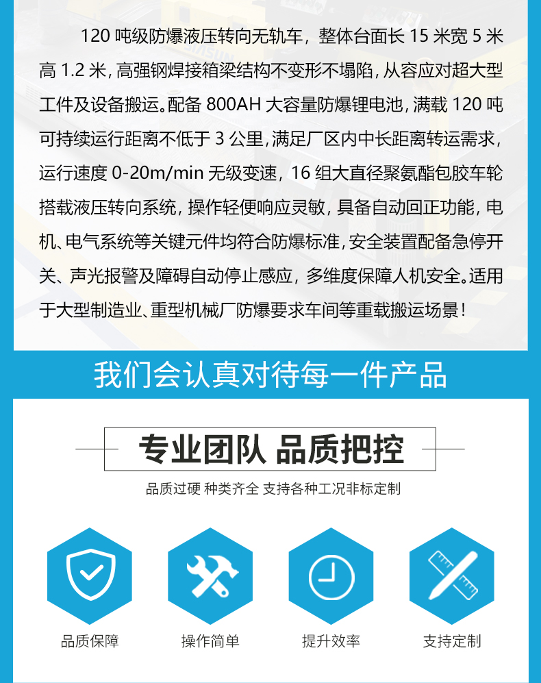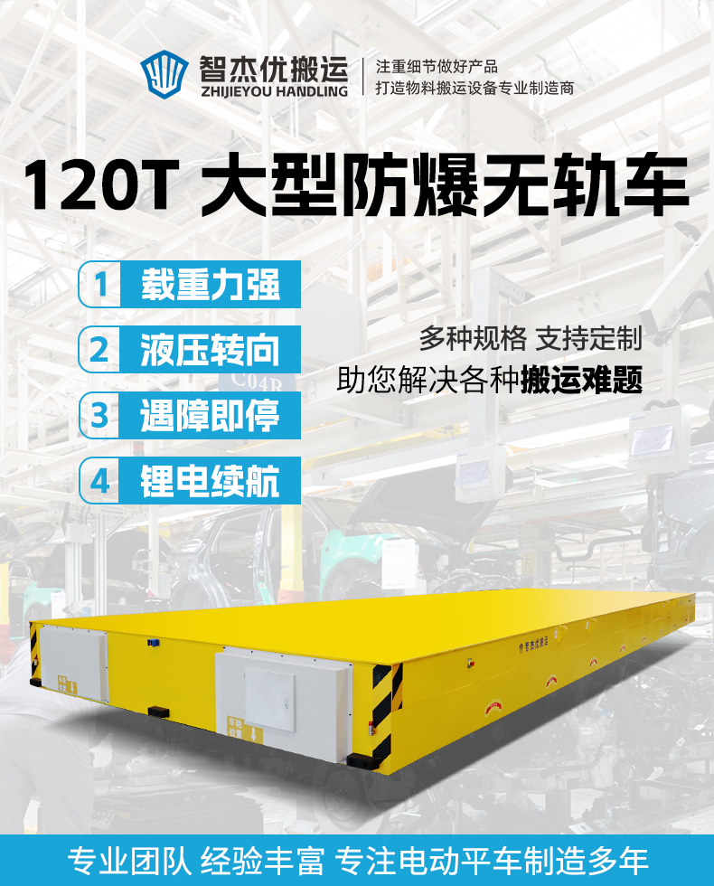 描   述: 120噸級(jí)防爆液壓轉(zhuǎn)向無軌車,集***承載、防爆安全與智能控制與一身的大型重載無軌車,適用于大型制造業(yè)、重型機(jī)械廠、鋼結(jié)構(gòu)施工、防爆要求車間等重載搬運(yùn)場(chǎng)景!
