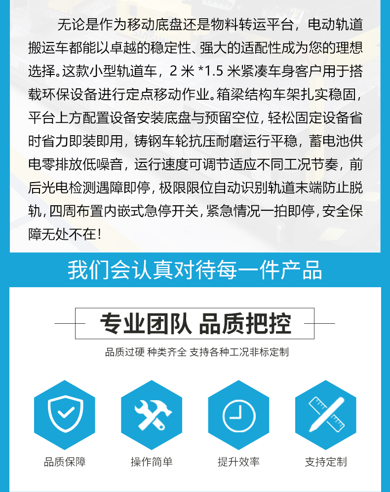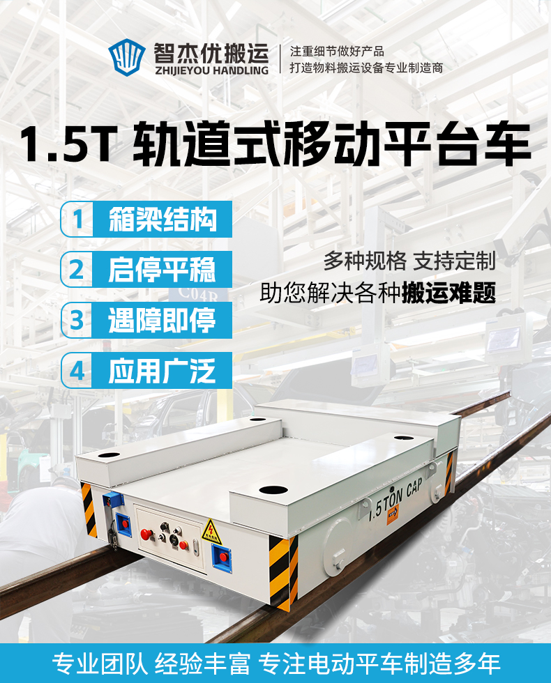 描   述: 環(huán)保設(shè)備需要移動底盤?這款小型軌道搬運車就很合適!卓越的穩(wěn)定性、強大的適配性和多重安全防護,無論用于設(shè)備的搭載作業(yè)還是車間內(nèi)的物料過跨,都是您的理想選擇!